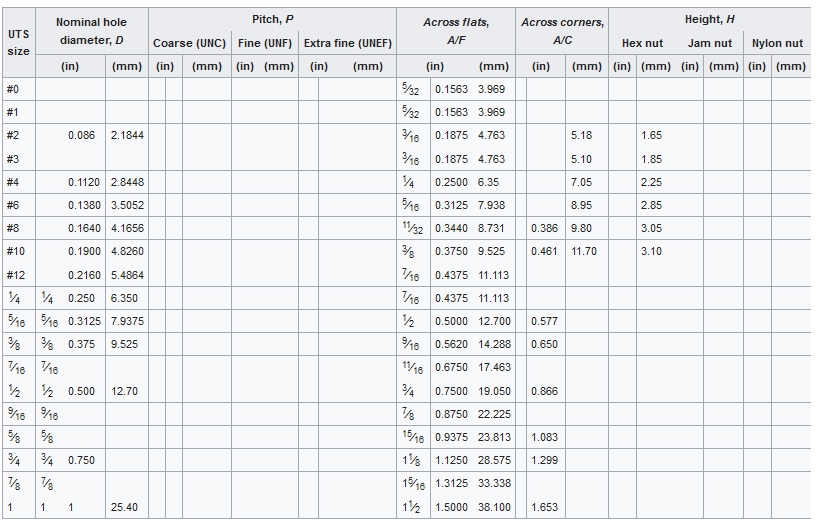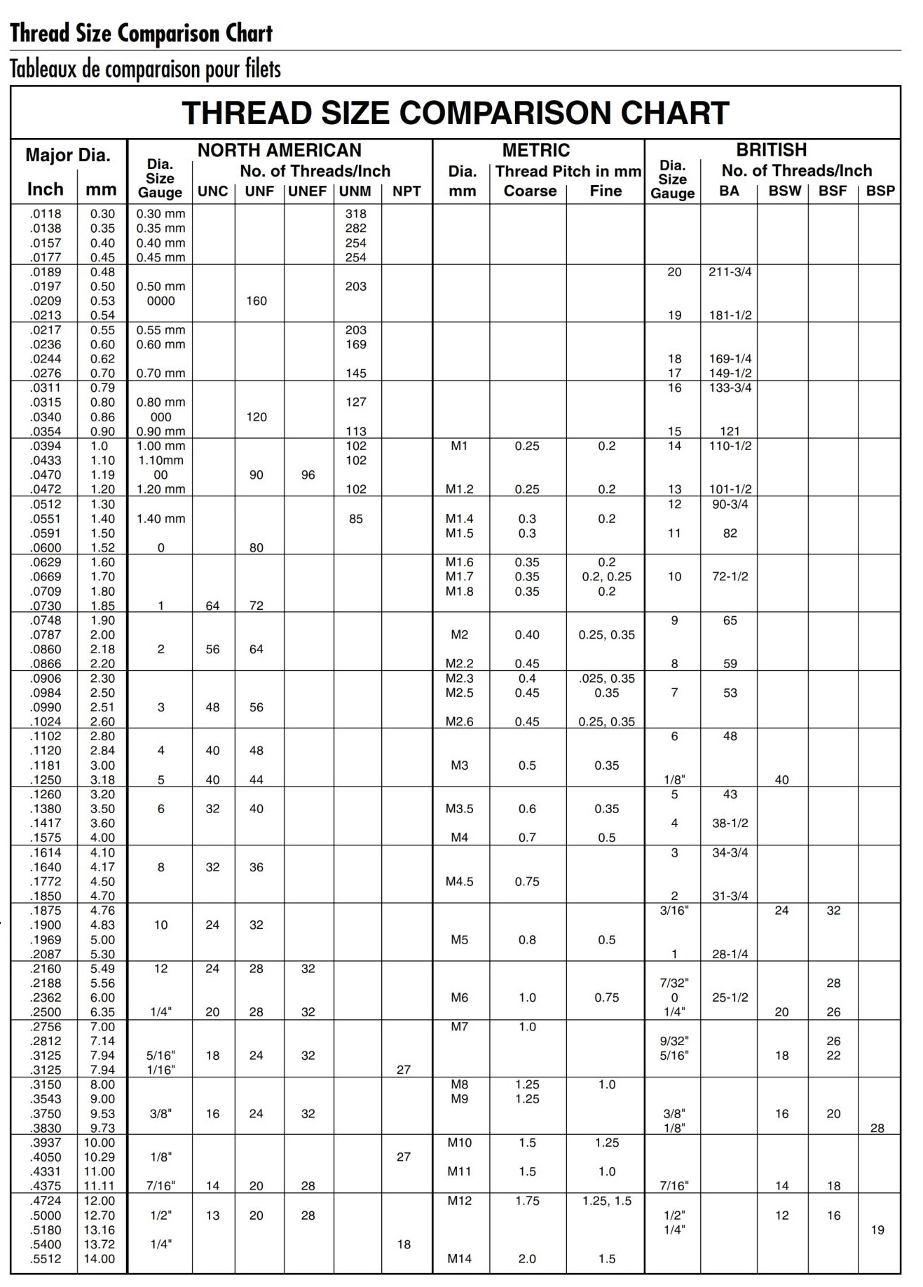 Thread size comparison chart